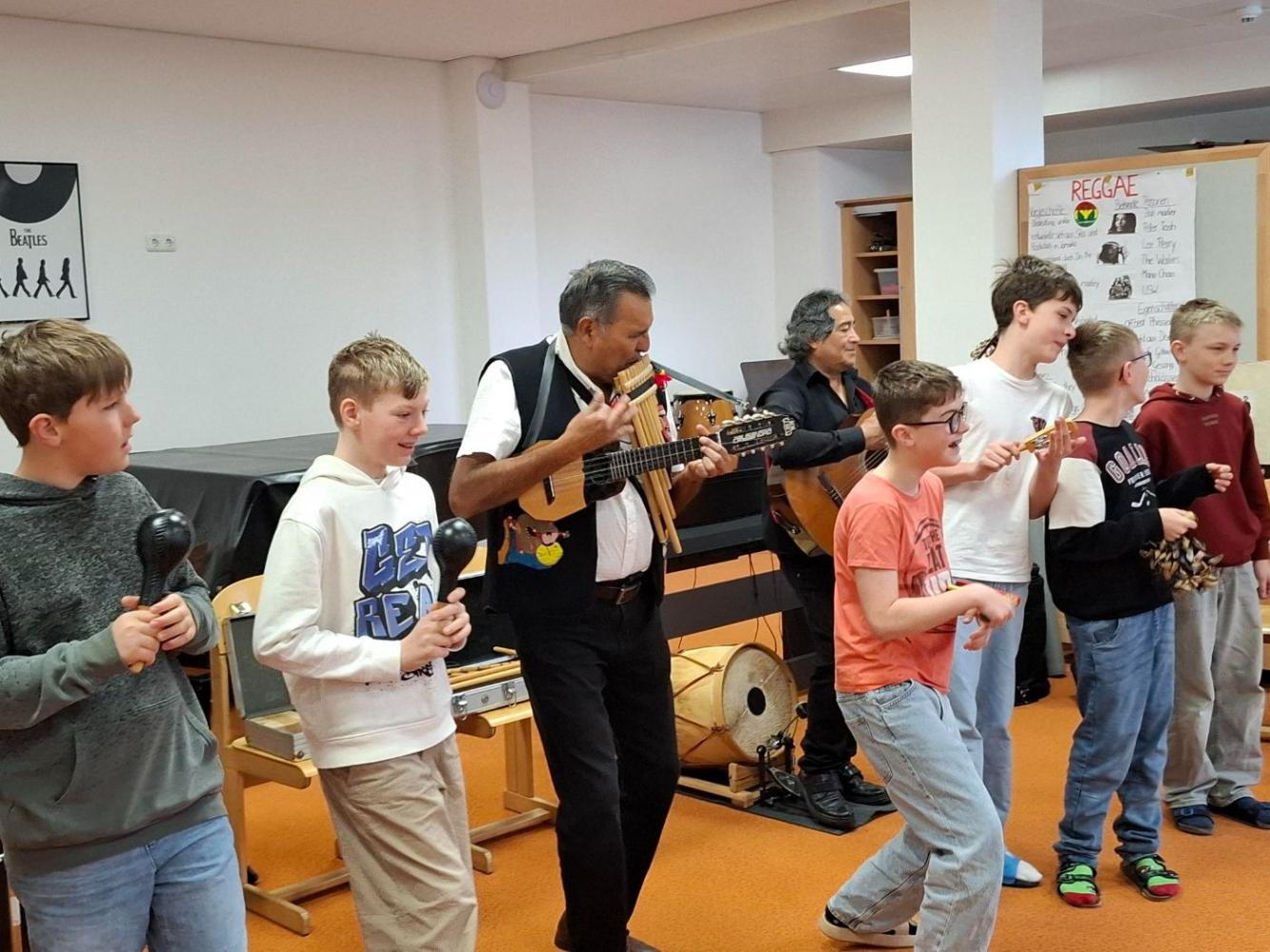 Zwei aus Peru stammende Musiker stellten am Dienstag, den 24. März 2026 musikalische Klänge aus dem lateinamerikanischen Raum vor. Dabei lernten die Jugendlichen der 2c Instrumente, wie die Panflöte näher kennen. Ebenso wurden bekannte Lieder zum Mitsingen geboten. Selbst eine Tanzeinlage durfte nicht fehlen. Neben der Musik wurde ihnen auch die Geografie und die Sprache des Landes erklärt. Vor allem das Ausprobieren der landestypischen Musikinstrumente aus Peru bereitete den Kindern viel Freude.