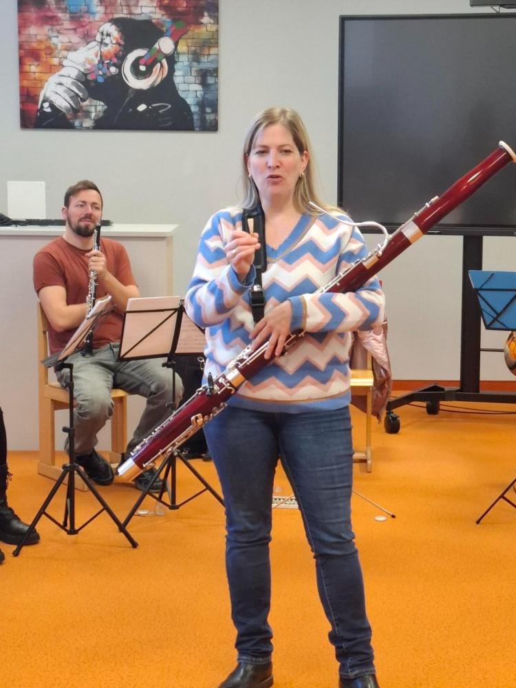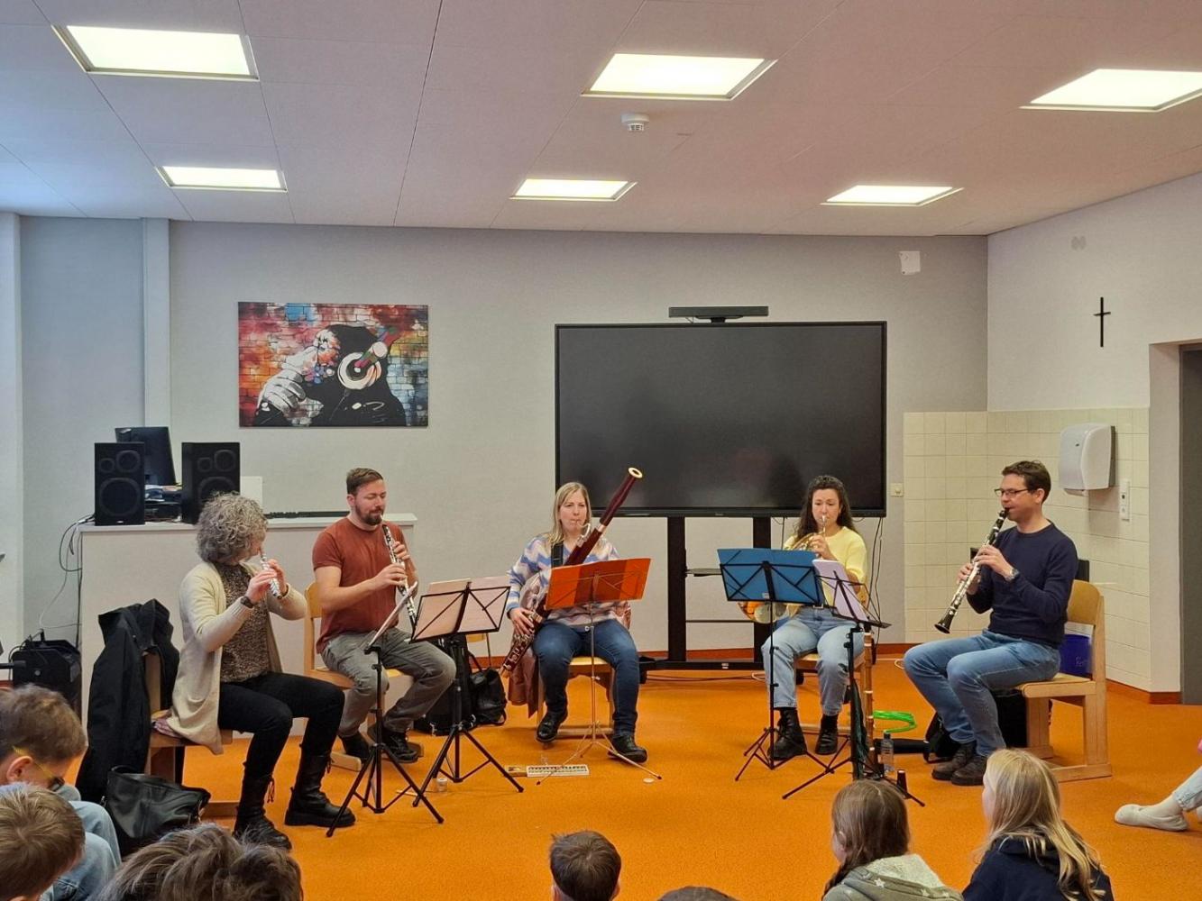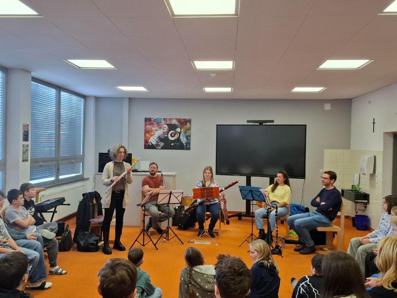 Am Freitag, den 23. Januar 2026 war das Tiroler Holzbläserquintett bei uns an der Mittelschule Fieberbrunn zu Gast. Die fünf Musiker/innen vom Tiroler Kulturservice präsentierten die mitgebrachten Instrumente und stellten sowohl ihre Bauart als auch die Spielweise der jeweiligen Musikinstrumente (Oboe, Flöte, Klarinette, Horn und Fagott) vor. Unsere Schüler/innen durften einige Bauteile näher untersuchen und bekamen vorgeführt, welche Materialien für die Herstellung verwendet werden. Es wurde auch erklärt, wie sich die einzelnen Musikinstrumente im Laufe der Jahrhunderte veränderten. Zu hören gab es unter anderem unterhaltsame Musikstücke von Wolfgang Amadeus Mozart. Die Lieder animierten die Kinder und Jugendlichen der 1c, 1d sowie der 2c zum Mitklatschen und bescherten eine Musikstunde der besonderen Art.