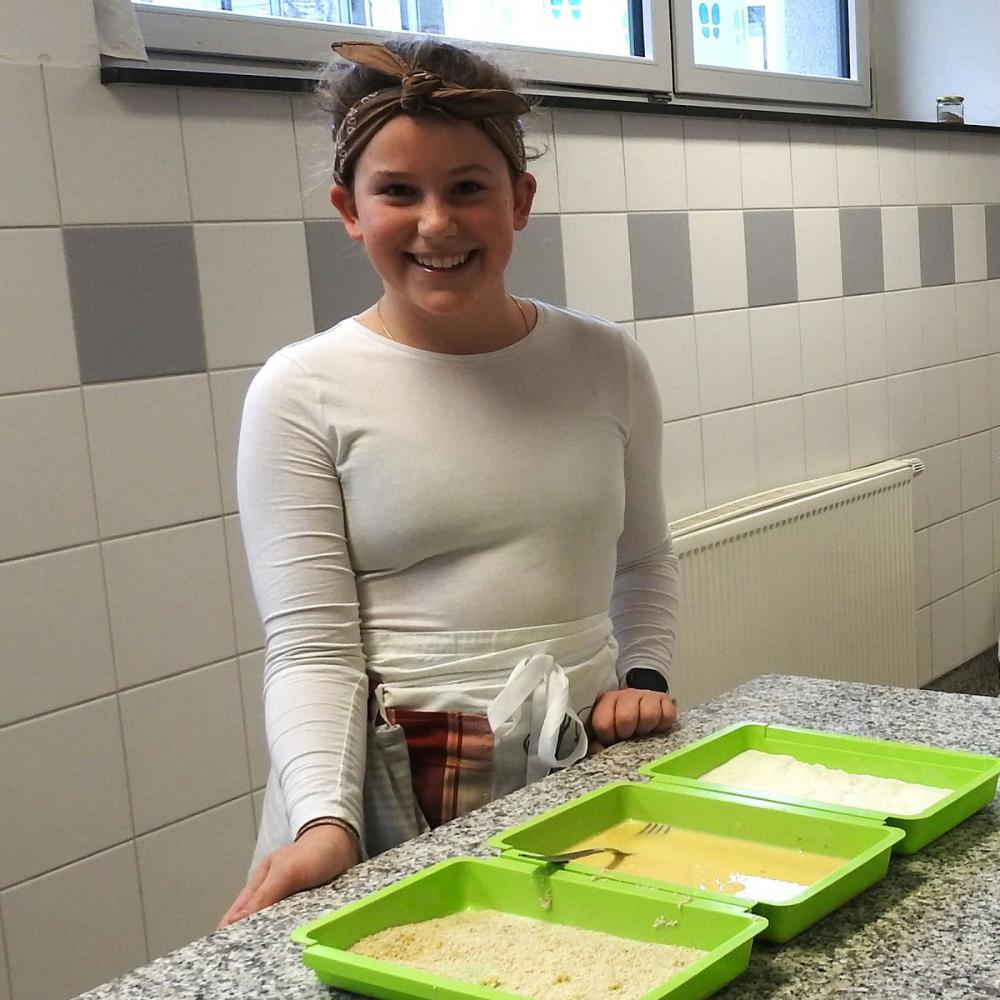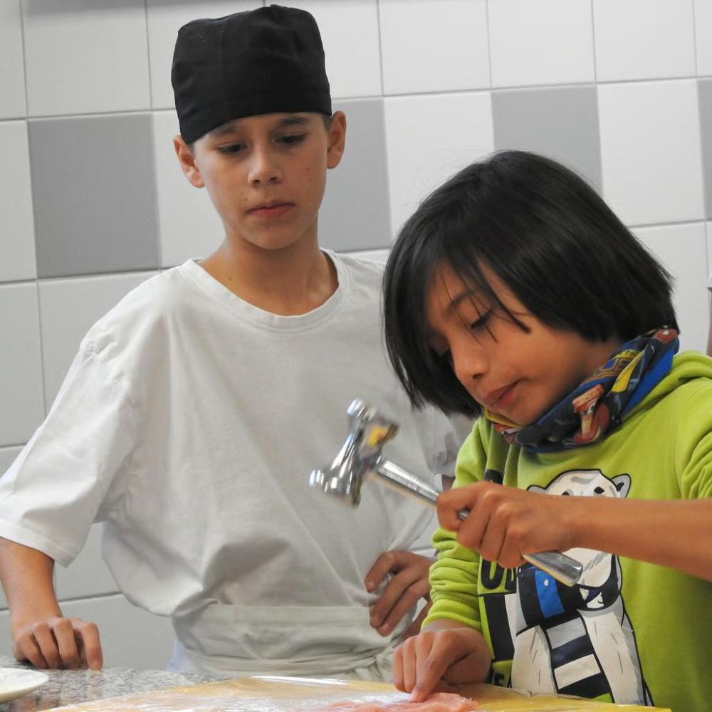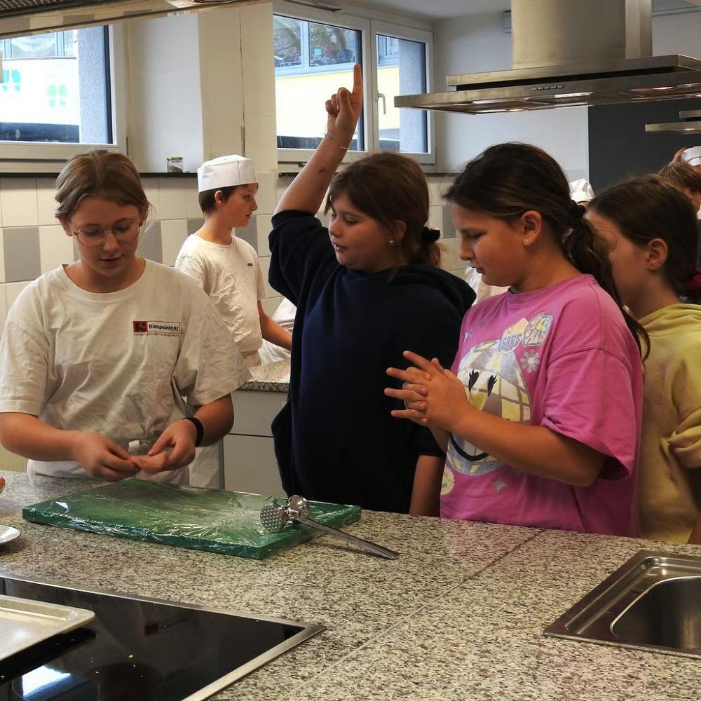 In kleinen Gruppen wurden die vielleicht zukünftigen Mittelschülerinnen und Schüler von den „Großen“ nach der Begrüßung von Direktor Strobl durch das große und frisch renovierte Schulhaus geführt und lernten auch einige Lehrpersonen kennen. Man sah den Kindern an, dass sie viel Spaß hatten und großes Interesse an den Aktivitäten zeigten. Höhepunkt auch diesmal das gemeinsame Essen im Speisesaal – gab es doch die zuvor selbst vorbereiteten Schnitzel mit Pommes!